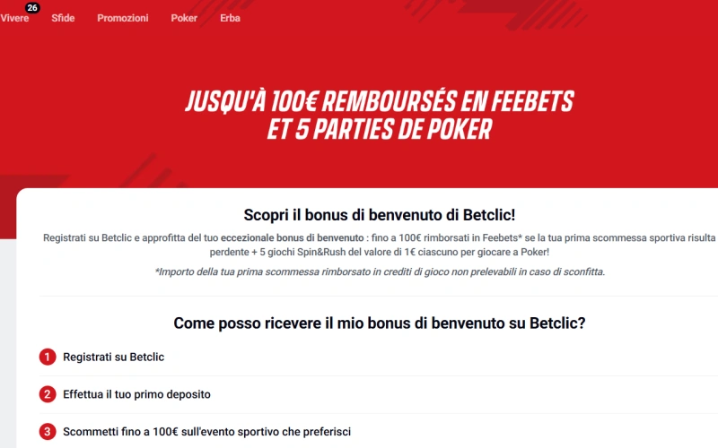 I nuovi giocatori che si registrano sulla piattaforma possono accedere a un’offerta promozionale dedicata. La promozione è riservata esclusivamente agli utenti maggiorenni che effettuano il primo deposito sul sito. Il Betclic casino bonus benvenuto prevede un match bonus percentuale sul deposito iniziale, con un importo massimo definito nei termini dell’offerta. Per attivare la promozione è necessario completare la registrazione e verificare il proprio account. Si applicano requisiti di scommessa standard prima del prelievo delle vincite.